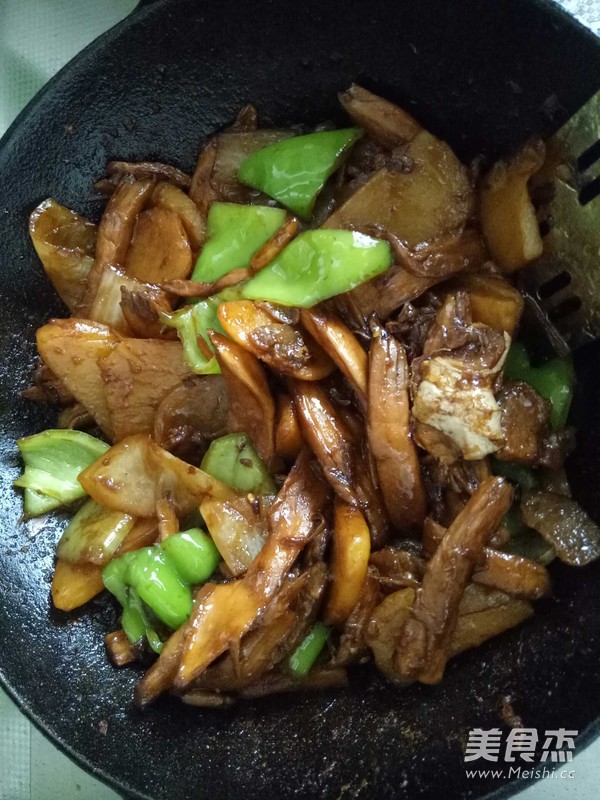 1.五花肉切大片,土豆切厚片,杏鮑菇手撕成條狀辣椒切片