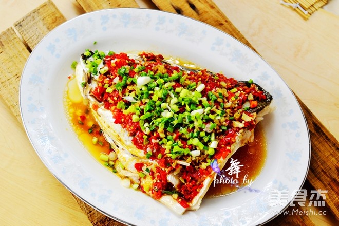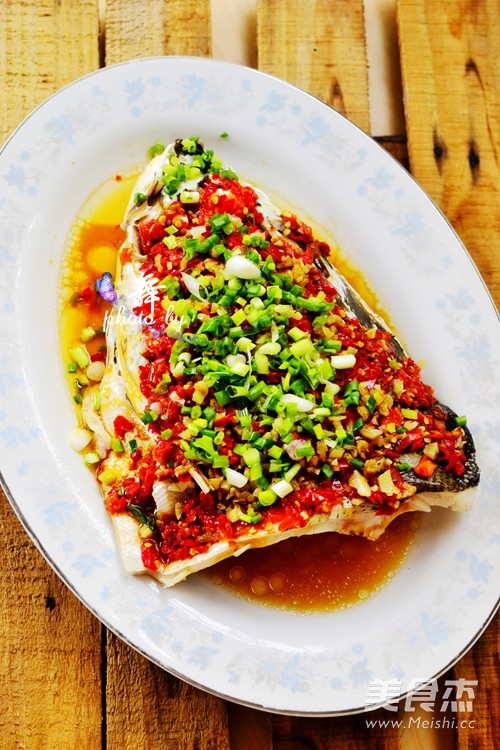 5.魚頭上鋪上蒜蓉放入蒸鍋中大火蒸制大概10分鐘左右關(guān)火燜片刻