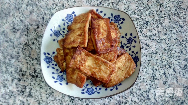 4.鍋中倒入少量油,燒熱中小火煎制豆腐塊。