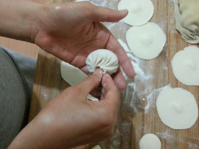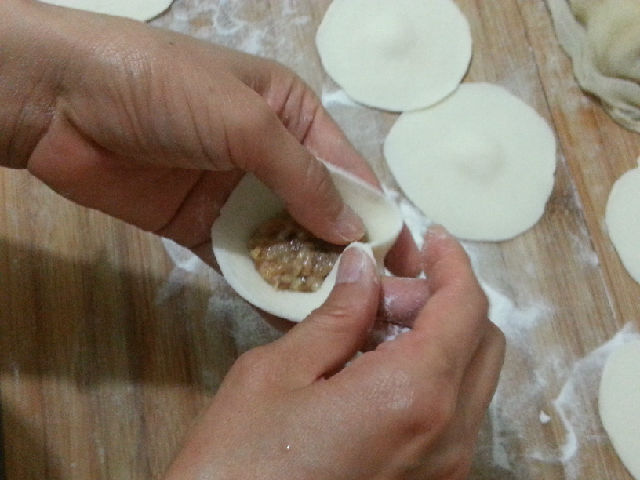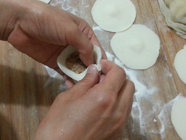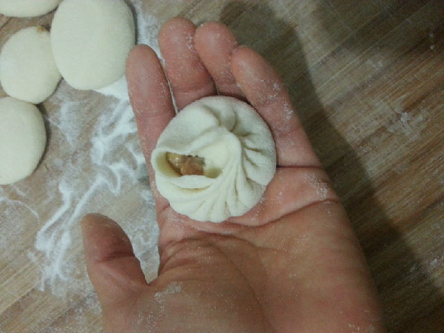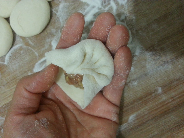 將餳好面團(tuán)揉成長(zhǎng)條形,分割成等大的小面劑,搟成四周薄中間厚的圓面片,取適量的肉餡填在面片里,左手托著面片,在左手食指往前推的幫助下,右手的大拇指和食指沿著面片的周邊順勢(shì)捏褶。