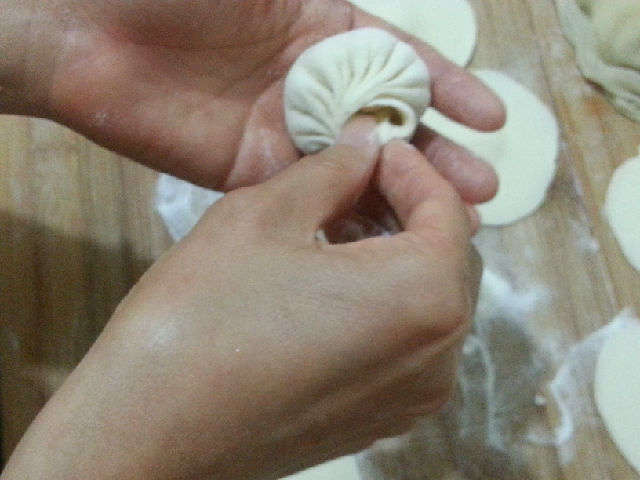 左手的大拇指可以幫助把肉餡往下壓,右手的食指在捏褶的時(shí)候可以稍微上提,這樣的小包子的才會(huì)裝比較多的餡。