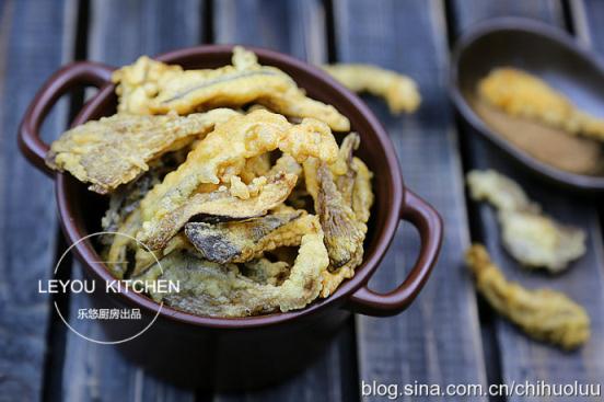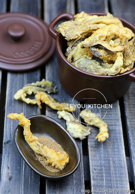 第七步:油燒熱后,將裹好面糊的蘑菇一條一條的放入油鍋中。(千萬(wàn)不要一次性全部放入鍋內(nèi),那樣容易粘連在一起。)
