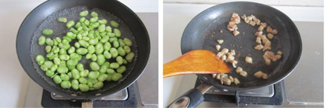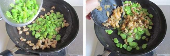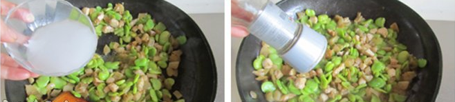 5. 雞丁翻炒變色后加入焯過(guò)的蠶豆米繼續(xù)翻炒;