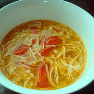 具體做法是,取金針菇100克,西紅柿100克,面粉20克,調(diào)味鹽、花生油、香油適量。將金針菇去根部,洗凈,拆分,西紅柿洗凈,切成條狀。熱鍋中加入少許花生油,油熱后倒入西紅柿,大火翻炒,然后倒入金針菇,翻炒后加入清水煮開(kāi);在碗中加入一勺面粉,倒入清水拌成稀糊,倒入鍋中,快速攪勻,煮沸,加入少許香油可食。