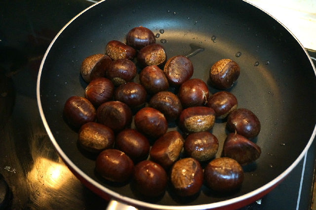 2. 每隔10秒左右晃一下,以使栗子受熱均勻。