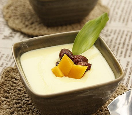 原料:土雞蛋2個、牛奶250毫升、杏仁10粒、芒果1個、白糖2湯匙