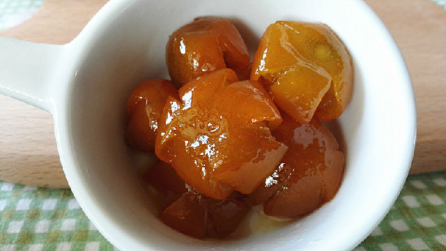 16、將金錢桔中的水分慢慢蒸發(fā)掉,讓湯汁慢慢變濃稠,發(fā)現(xiàn)湯汁越來(lái)越少且勺子攪拌不暢的時(shí)候就表明熬好了。
