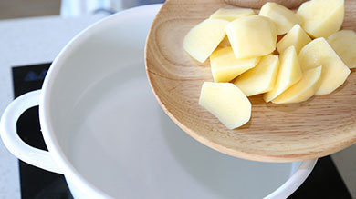 1、土豆清洗干凈后去皮,然后切成滾刀塊,冷水入鍋,根據(jù)需要和土豆塊大小,焯好以后撈出。