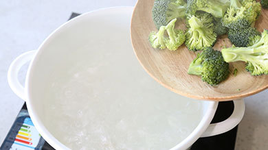 1、水加熱至沸騰以后,加入清洗干凈的西蘭花,大約焯一分半鐘即可。