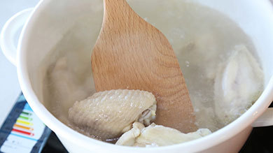 冷水焯。食材清洗后冷水放入鍋中,一起加熱→加熱過程中翻動原料→撈出備用