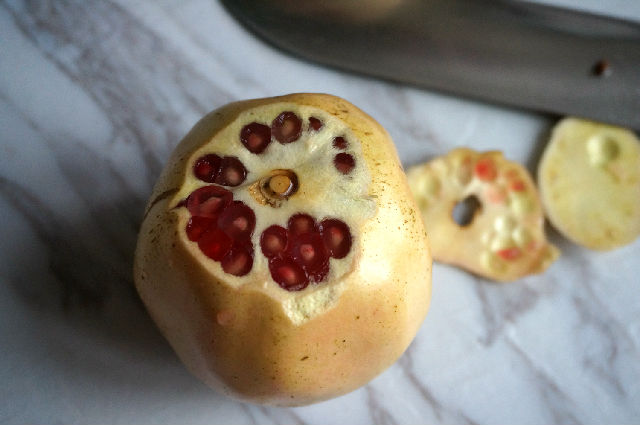 2. 用利刀將兩端分別削掉,頂端長(zhǎng)花的部分可以削得深一些,與石榴籽平行;