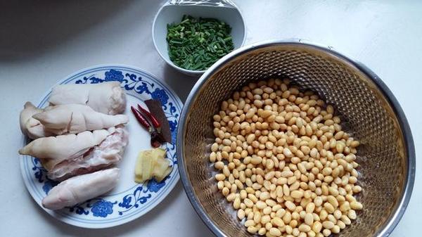 做法:1.黃豆提前用清水浸泡四小時以上,冬天可過夜,夏天放冰箱冷藏浸泡。豬蹄清洗干凈剁塊。生姜去皮洗凈切片,青蒜洗凈切末。