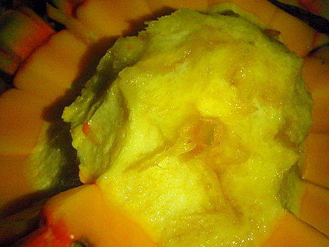 4、最后里面會剩一個很像地瓜的果肉芯...可以將他切成小塊...