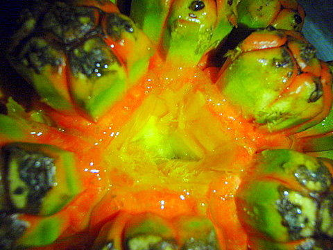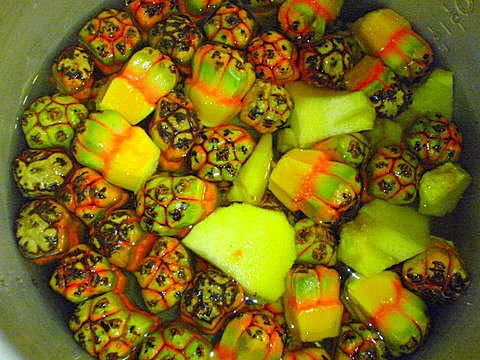 5、切好后, 將果肉跟果芯一起放入鍋內(nèi) (我用大同電鍋, 就不用顧火了), 加入大約一比一的水...然后煮大約2小時左右...這時你會發(fā)現(xiàn), 生的林投果沒有的甜味, 煮過之后, 就出現(xiàn)了像是紅蘿卜或是玉米煮水的香氣及甜味...