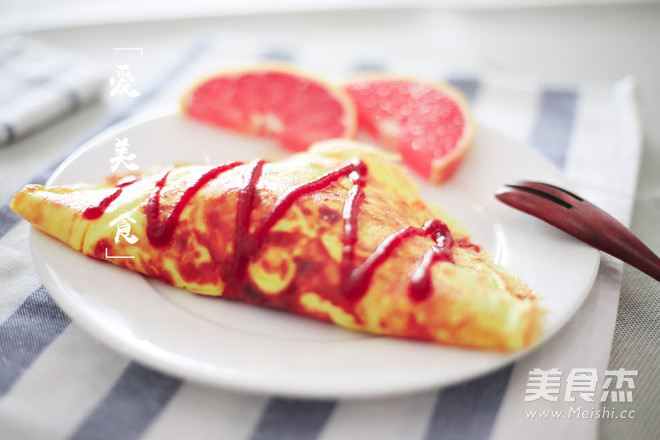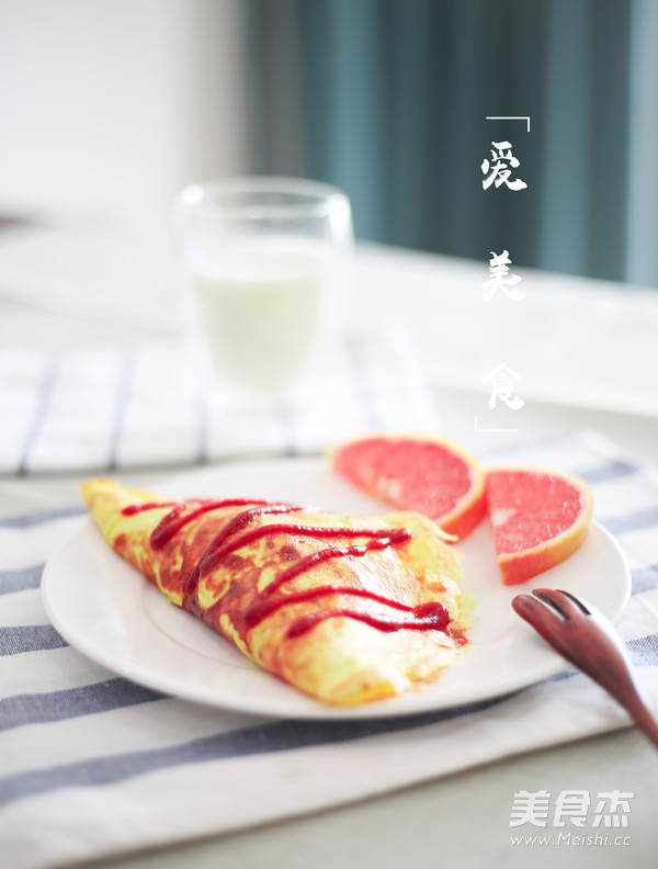 7.將蛋包飯倒扣入盤(pán)中,擠上番茄醬裝飾