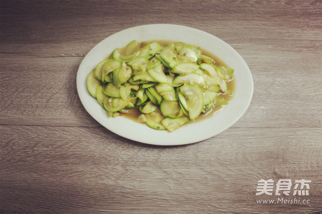 3.倒入西葫蘆不停翻炒,等西葫蘆塌架軟后,放入蒸魚豉油,鹽和少許雞精。