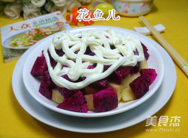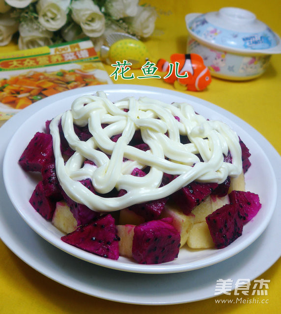 4.然后,將切好的蘋果和火龍果擱入盤子中。