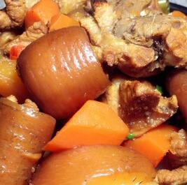 豬尾巴1條 胡蘿卜1個(gè) 青椒1個(gè) 紅椒1個(gè) 料酒10g 鹽10g 冰糖5g 生抽15g 老抽5g 姜2塊 蔥2根