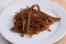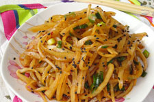 3、翻炒過(guò)程中可以加入少量清水,菜絲變色之后調(diào)入味精、鹽,翻炒均勻,撒上蔥段翻炒幾下即可出鍋。