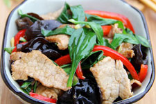 2、鍋內(nèi)倒入油,待油熱后下肉片,炒至顏色變白即可加入蔥姜蒜末炒香,再倒入木耳紅椒炒一分鐘加入車前草炒軟加入食鹽即可出鍋