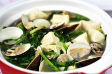 主料:鹵水豆腐1塊,文蛤16個(gè),茼蒿1把。調(diào)料:食鹽1/2茶匙,蔥1段,姜1塊,水,食油。