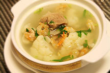主料:豬骨湯1500ml,花椰菜400g,蝦米80g。輔料:葡萄籽油,雞粉,香菜。
