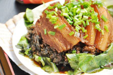 6、鍋內(nèi)留油,放入冬菜翻炒熟后放到擺好五花肉的碗中,上蒸鍋蒸兩個(gè)小時(shí)。