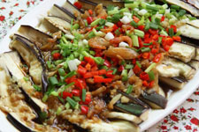 3、將炒至好的冬菜、蝦米和調(diào)料汁淋在茄子條上面,上鍋蒸15分鐘左右。