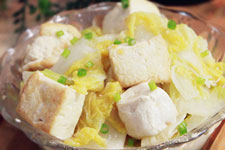 1、洋白菜切滾刀塊后洗凈,將水瀝干備用,凍豆腐切塊,蔥切段。