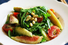 主料:牛油果2個(gè),芝麻菜適量。輔料:無(wú)花果1個(gè),圣女果適量,松子仁適量。調(diào)料:食鹽適量,橄欖油適量,黑胡椒適量,檸檬汁適量。