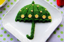 4、用牙簽在盤子上畫出小傘的輪廓,然后用勺子將油菜泥一點點裝入,用筷子壓出花邊,劃出條紋,再用磨具或者吸管吸出一定形狀的奶酪做點綴,這樣就完成了。