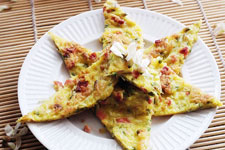 3、鍋內(nèi)倒入適量植物油燒熱,倒入攪拌好的蛋液,用鏟子攤平后小火煎至兩面金黃,盛出劃成小塊即可。