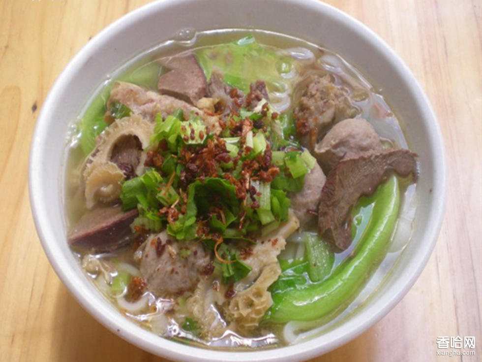 西藏牛肉粉放在大肚翻邊郁金香形的碗里,清平的湯中白條壯的粉歷歷,牛丸堆在中間,碗邊擠滿蒜茸和芹菜末,聞上去香沁肺腑。趕快倒一點醋進去,然后放小半勺特制的香辣椒油。湯中映紅,白色的粉染上香辣,這時拿筷子挑起先放入左手的白瓷勺,再將白瓷勺放入嘴中,爽滑滋味一下子入胃,再夾一枚牛丸咬一口,辣辣的肉香和粉香達到極致。吃完如果余味未了,還可以大口大口將湯喝光,滿是滋味的湯里有蒜茸、芹菜末、碎粉和椒油香,熱熱的下肚,帶著滿足出門去。