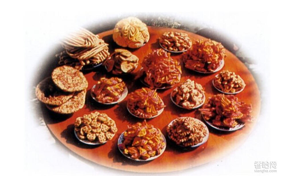 油炸果是臨夏地區(qū)的穆斯林婦女精心制作的一種工藝獨特、造型奇麗、圖案清晰、用料考究、香甜脆酥、頗為可口的傳統(tǒng)油炸食品。油炸果的種類繁多,諸如:桃花、菊花、梅花、蓮花、牡丹、柳樹、石榴、葫蘆、佛手、桃子、姜片、蛟龍、鳳凰、麻雀等等,枚不勝舉。