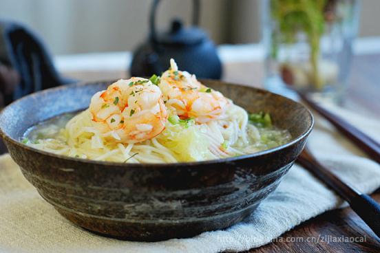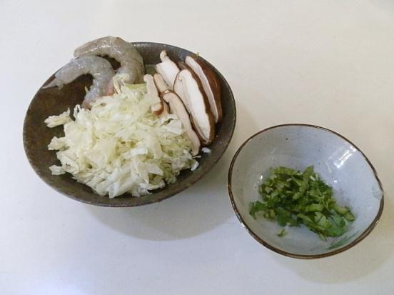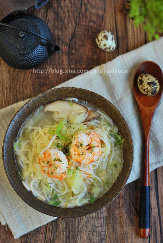 原材料:白菜葉、香菇、蔥、姜、蒜、香菜、青蝦、掛面(生鮮面)、水。