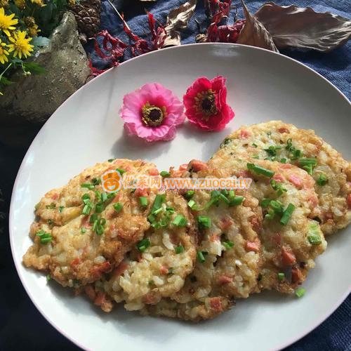 5.在打散的雞蛋中分別加入米飯以及切成小塊的白菜莖、火腿腸、蔥后再加入適量的鹽、五香粉、胡椒粉拌勻……