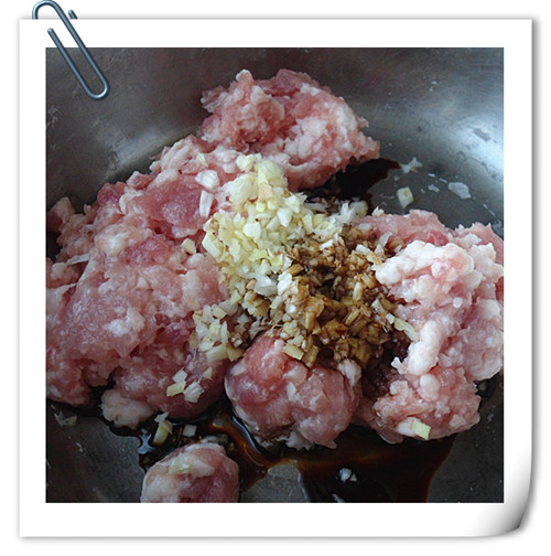 5、豬五花肉餡,加入蔥姜,醬油調(diào)勻。