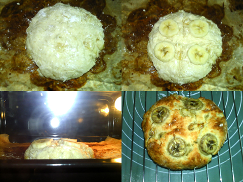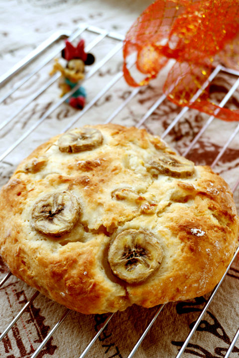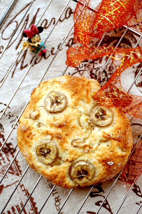 2、面團滾上手粉,整理成圓形,放入烤盤。將1/4根香蕉切成圓片,擺放在表面。用刀切成十字開口。放入烤箱,中層,上下火170度,烤約30分鐘左右。表面金黃,出爐。