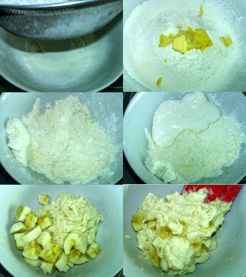 1、將面粉,鹽,泡打粉混合過篩。加入糖和黃油,抓搓成粗粉狀。加入酸奶。拌至無干粉狀態(tài)。半根香蕉切碎,加入面團中。拌勻。