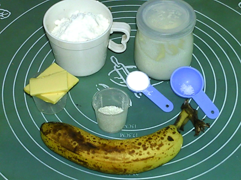 用料:中筋粉90克,泡打粉1小勺,香蕉3/4根,黃油15克,糖10克,原味酸奶75克,鹽少許,手粉適量