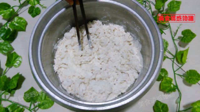 2、面粉與酵母混合,慢慢倒入溫水,邊倒邊用筷子攪拌成絮狀。