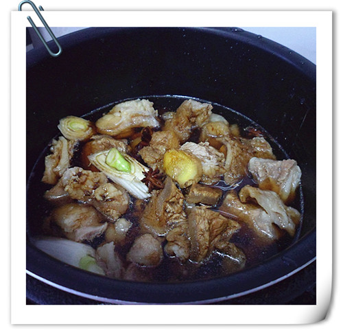 將牛肉放入電壓力鍋,加水,放醬油,料酒,甜面醬,蔥姜,大料,鹽,白糖燉制。