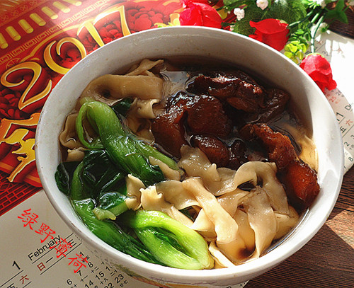 原料:牛背筋肉,牛腱子把兒,寬面條,油菜,料酒,醬油,大料,甜面醬,鹽,白糖。