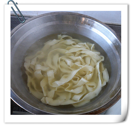 開水下鍋煮寬面條,煮熟撈出放入碗里。