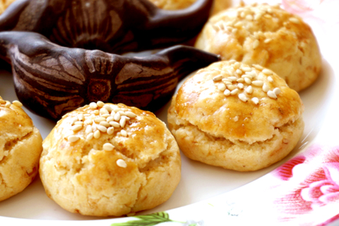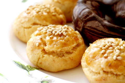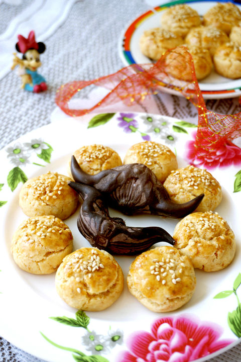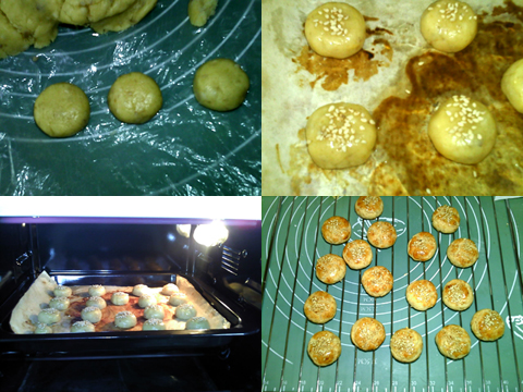 2、取適量,做成均勻小圓餅狀。擺入烤盤,表面刷蛋液,粘上芝麻,放入烤箱,中層,上下火,180度,烤約20分鐘左右。表面金黃,出爐。