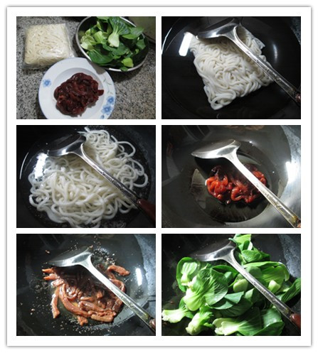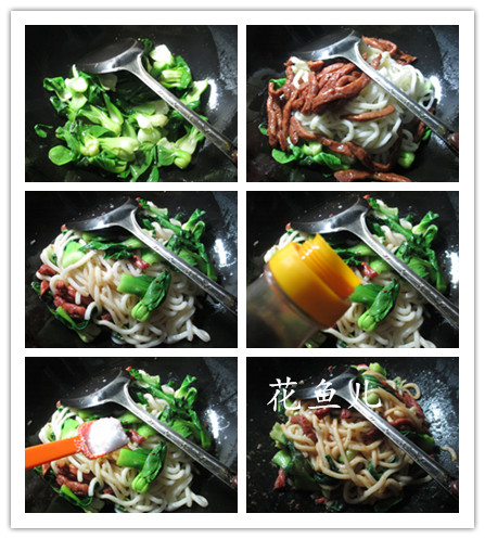 (4)然后,合入焯好的烏冬面和炒好的牛柳翻炒一下。