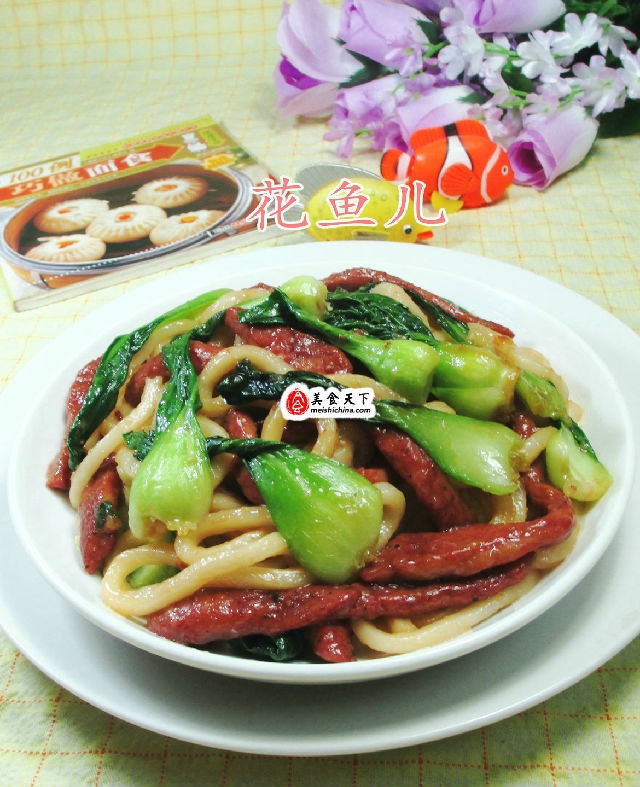 (3)接著,下入已洗凈的青菜翻炒翻炒至熟。