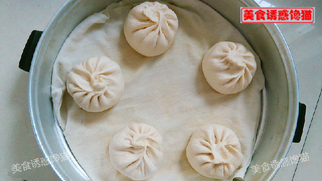 7、將包好的包子放入鋪有濕屜布的蒸籠上,中間要有間隔,因為蒸的時候還會變大。二次醒發(fā)20分鐘(根據(jù)溫度調(diào)整醒發(fā)時間)至二倍大。