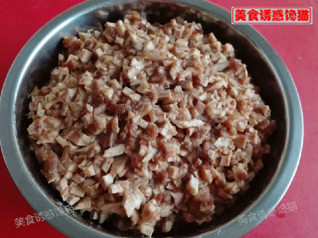 2、將肉末、香芋、植物油、鹽、雞精、叉燒醬順一個方向攪拌均勻備用。