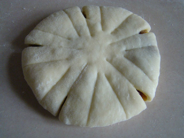 面團(tuán)原料:高粉250克,細(xì)砂糖40克,鹽1/4小匙,全蛋55克,酵母粉3克,牛奶100克,黃油20克。